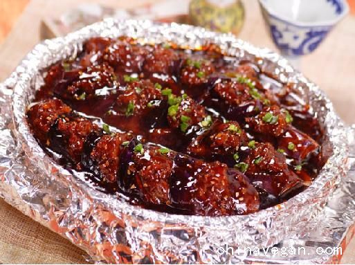 3、锅置旺火上,放入植物油,烧至六成热时,将茄子裹上糊,下锅炸至金黄色,倒入漏勺沥干油,摆入垫有洋葱丝的热铁板上。