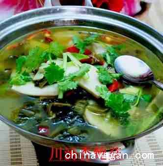 6、起锅,放入精制油50克, 放入姜片、芹菜段爆香,加入酸咸菜小火煸香大约1分钟左右,放水1千克改大火,烧开2到3分钟,放入干辣椒改用小火, 放盐2克、素易鲜3克、白醋5克,下入杏鲍菇、下入青红椒煨制一下出锅,装在锅仔内香菜点缀即可。