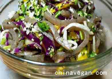上白醋、橄榄油,滴上几滴香油,混合搅拌均匀,放在碗中渍上几分钟,最后装盘,即可食用。 ( 参考:新浪线球)