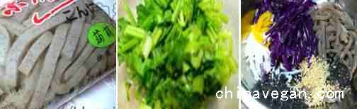 材料:棕色魔芋条,紫甘蓝,黄色甜椒,白萝卜,香菜,黑色、白色熟芝麻;凉开水,盐,蘑菇精,白醋,橄榄油,香油;