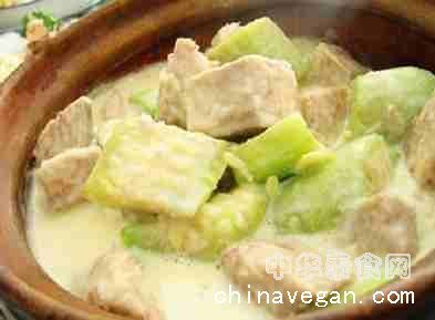 3、武火滚后改文火滚至熟后,再放下丝瓜,加入椰浆、稍滚片刻,