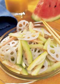 制作方法:1、将西瓜皮削去外层绿皮,去掉内层红瓤,切成条。2、将莲藕洗净刮去外皮,切成片,泡在凉水盆中。3、将瓜条、藕片分别在开水中烫一下,取出沥干水分。4、在瓜条、藕片中加入适量橙汁、盐、白糖拌匀,色泽呈淡黄色,即可装盘食用。
