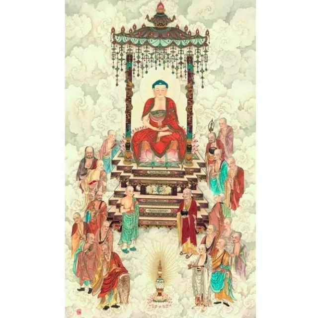 经文中首先列举了十六位尊者。列这十六位尊者是什么含义?实际上是表明十六个类别,十六位尊者列名分为八对。