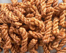 使用提示:每次1~2根,约50克麻花颜色棕黄,质地酥脆,香甜可口,男女老少都爱吃,有人形容说“嚼着惊动十里人”。营养分析:麻花的营养成分主要有碳水化合物、脂肪、蛋白质等,属油脂类、高热量食品,不宜多食。 制作指导:用面粉加发酵面和水揉在一起,成面团,加盐或糖(以别咸、甜不同),搓成股拧成麻花形,入油锅用七成熟热油炸透炸熟捞出即成。相关人群:一般人群均可食用