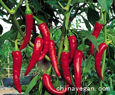 辣椒 又叫番椒、海椒、辣子、辣角、秦椒等,是一种茄科辣椒属植物。辣椒属为一年或多年生草本植物。果实通常成圆锥形或长圆形,未成熟时呈绿色,成熟後变成鲜红色、黄色或紫色,以红色最为常见。辣椒的果实因果皮含有辣椒素而有辣味。能增进食欲。辣椒中维生素C的含量在蔬菜中居第一位。