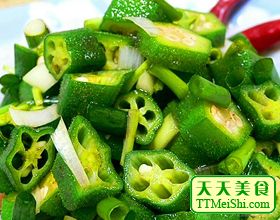 1) 将秋葵洗干净,放入沸水中烫熟,捞出;