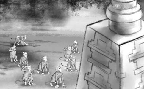 在这座山有五百只猴,每天看到那些出家人在那里建塔,又是用很虔诚的心,在那里膜拜,一边建塔一边膜拜修行,这五百只猕猴看了,同样随着人拜,过了一段时间,忽然间,山上下大雨,水从山上冲下来,五百只猕猴被水冲走了,都死了,生到天上。